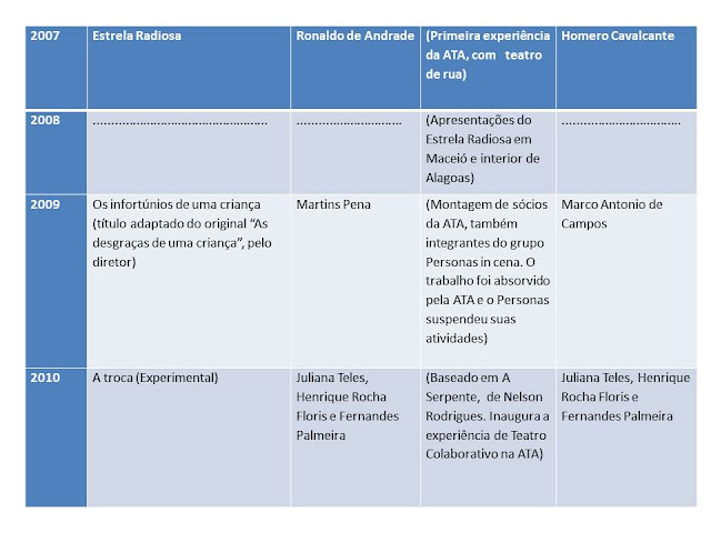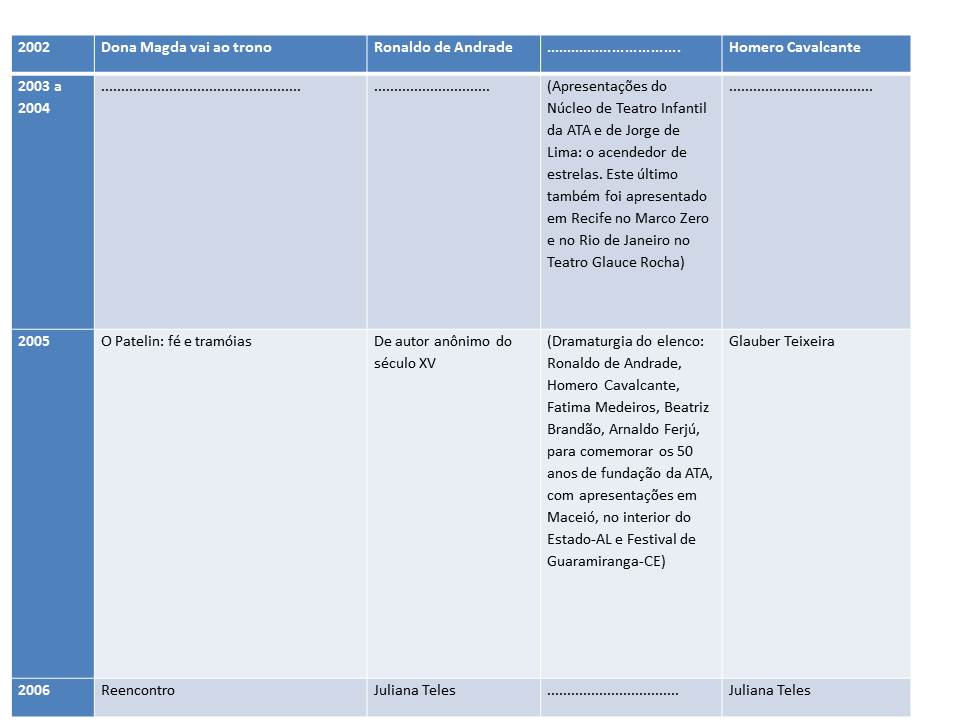Levantamento de textos montados pela ATA de 1956 -- 2018, com o objetivo de estudo e acessibilidade para interessados. A trajetória dramatúrgica da Associação Teatral das Alagoas (ATA): uma leitura dramatizada.